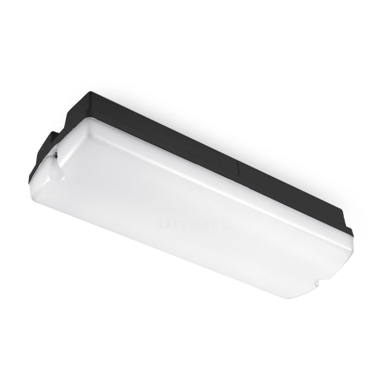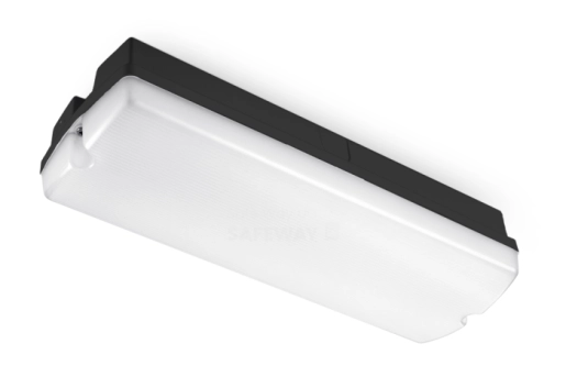 La lampe de secours en saillie étanche (IP65) Donau 350 Gallery 3000K est dotée d'un boîtier noir et d'un couvercle en polycarbonate transparent et résistant aux chocs.